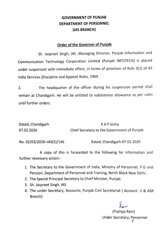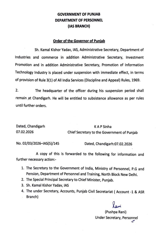 चंडीगढ़। पंजाब सरकार ने एक बड़ी प्रशासनिक कार्रवाई करते हुए दो सीनियर IAS अधिकारियों को तुरंत प्रभाव से सस्पेंड कर दिया है। इन सस्पेंड किए गए अधिकारियों में कमल किशोर यादव और जसप्रीत सिंह शामिल हैं। सरकार की ओर से जारी आदेशों के मुताबिक दोनों अधिकारियों के खिलाफ यह कार्रवाई प्रशासनिक कारणों के चलते की गई है।