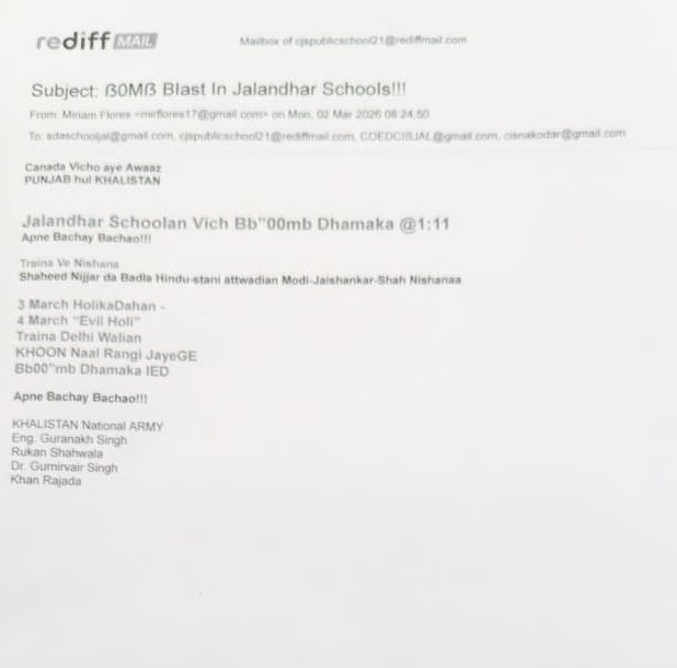 जालंधर ब्यूरो. जालंधर के कई प्राइवेट स्कूलों को बम से उड़ाने की धमकी मिलने से हड़कंप मच गया। एपीजे, कैंब्रिज, सीजेएस, पुलिस डीएवी स्कूल प्रबंधन समेत कई स्कूलों को ईमेल के जरिए यह धमकी मिली है। पता चलते ही स्कूल मैनेजमैंट ने तुरंत पुलिस को इसकी जानकारी दी। पुलिस टीमें मौके पर पहुंचीं और इन स्कूलों के परिसरों को सुरक्षा के घेरे में ले लिया। विद्यार्थियों और स्टाफ की सुरक्षा को प्राथमिकता देते हुए एहतियाती कदम उठाए गए। स्कूल में छुट्टी कर दी गई। बच्चों को बाहर निकाला गया।