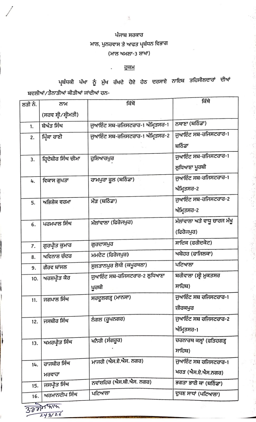 पंजाब सरकार ने बड़े स्तर पर किए तबादले, देखें लिस्ट आज की ताजा खबर पंजाब March 20, 2026March 20, 2026anuLeave a Comment on पंजाब सरकार ने बड़े स्तर पर किए तबादले, देखें लिस्ट Spread the loveपंजाब. पंजाब सरकार ने ब़डे स्तर पर तहसीलदारों के तबादले किए हैं। कुल 51 तहसीलदारों के तबादले हुए हैं।